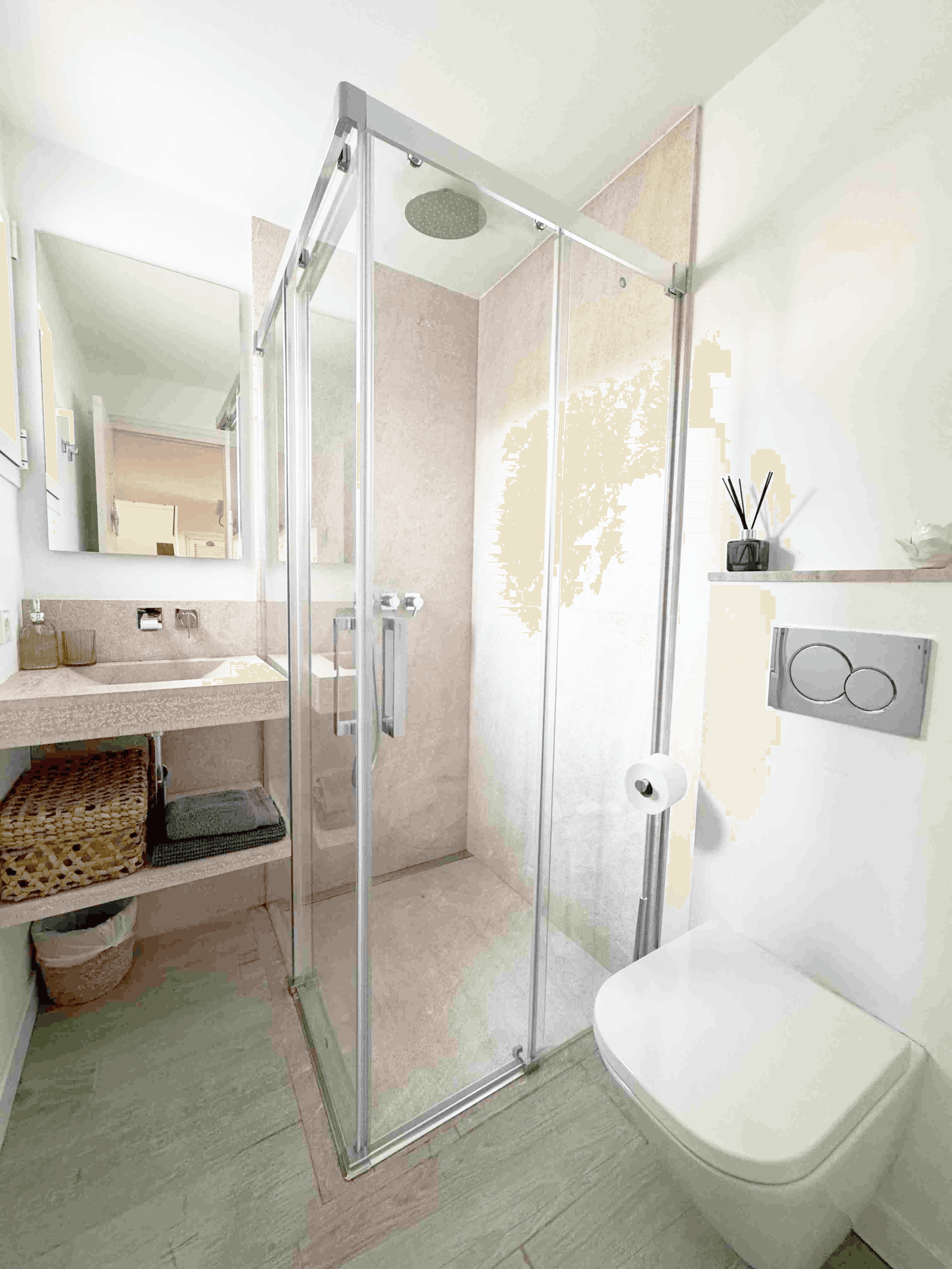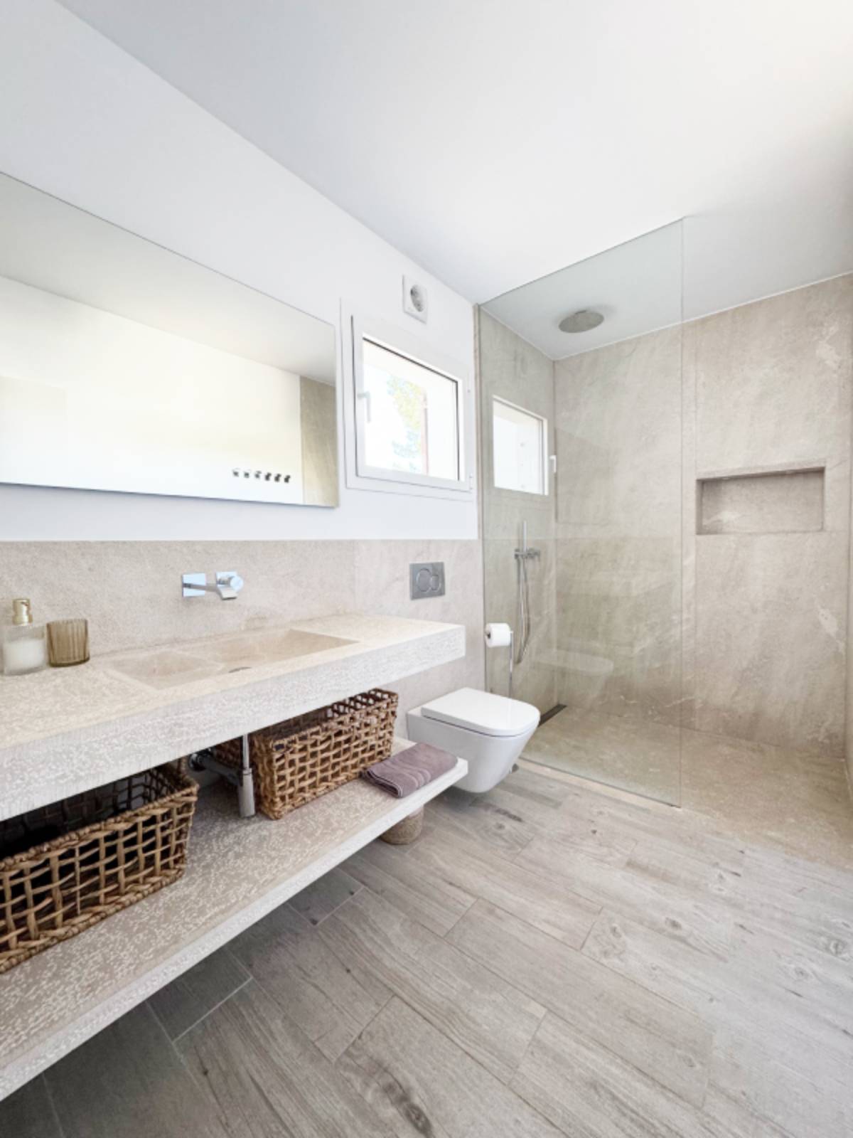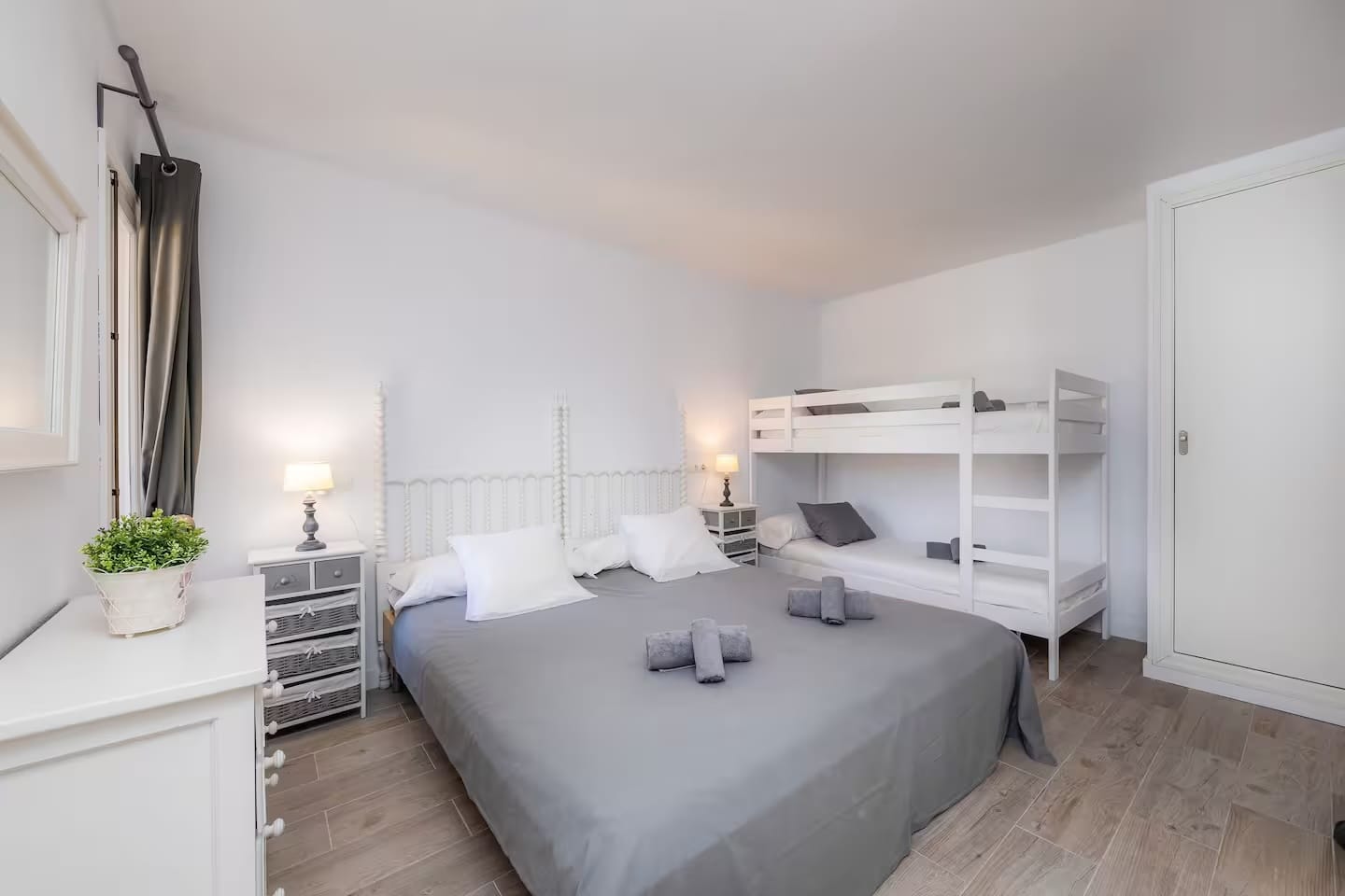 The two double bedrooms are located on the upper floor, offering a comfortable and quiet space for rest. The master bedroom is very spacious and has direct access to the terrace with partial sea view. The second bedroom is ideal for kids and larger groups, with two single beds and a bunk bed for two people.