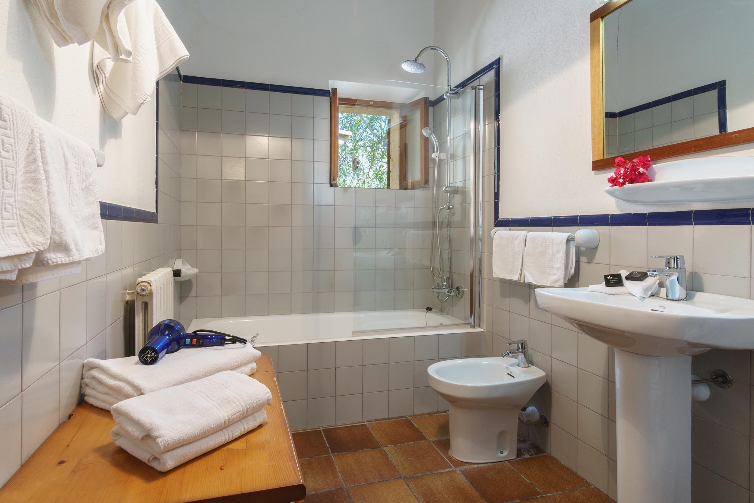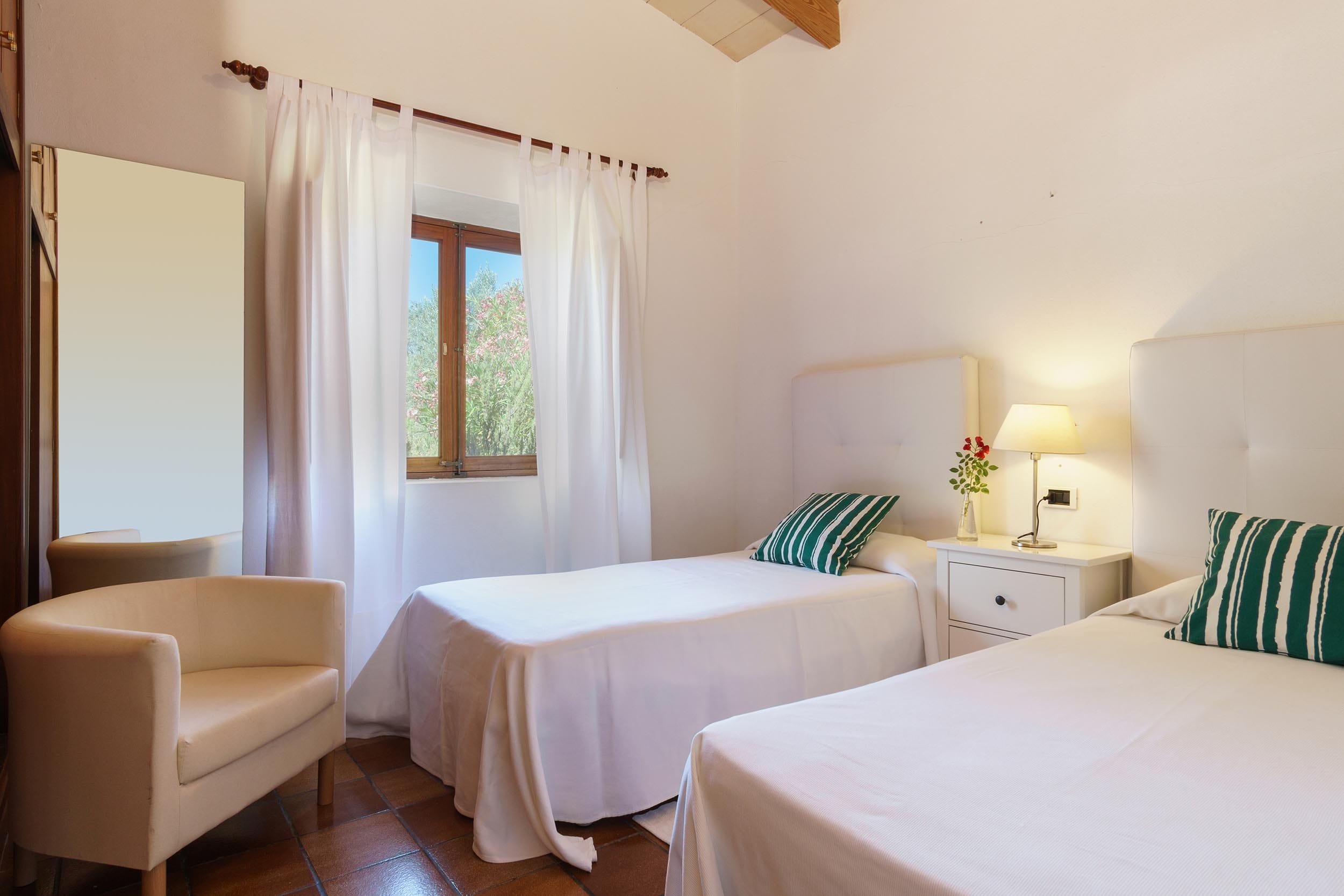 La zona de descanso se organiza a través de un pequeño distribuidor que da acceso a tres dormitorios dobles: uno con camas individuales y dos con cama de matrimonio. Una de ellas cuenta con un baño en suite con ducha. Hay un segundo baño completo con bañera, compartido por los otros dos dormitorios.