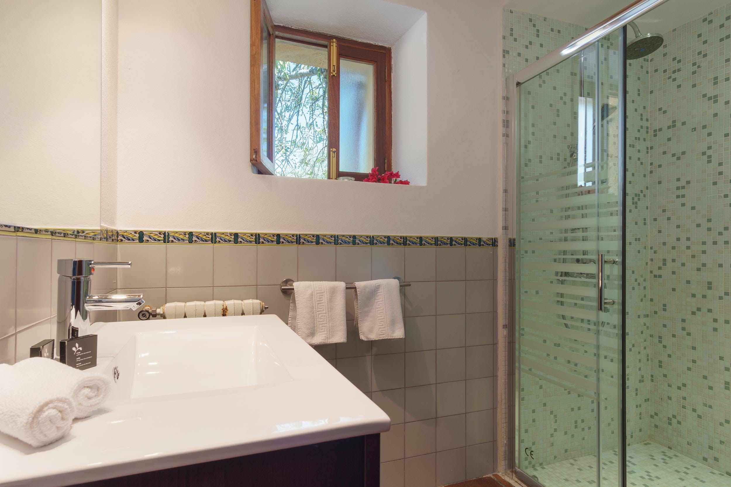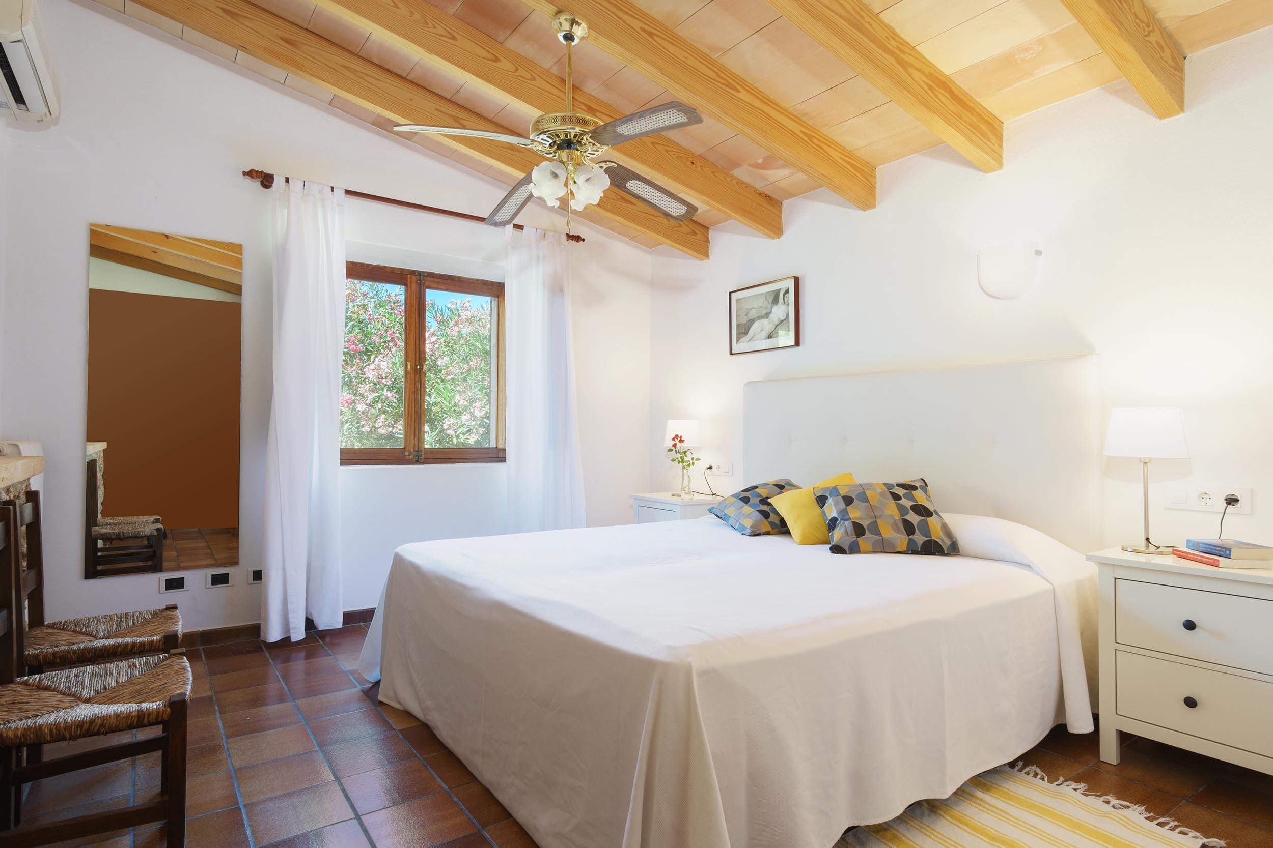 Los suelos de barro cocido, la calidez de la madera y la luz natural crean una atmósfera relajante. La casa cuenta con aire acondicionado en todas las habitaciones y calefacción central.