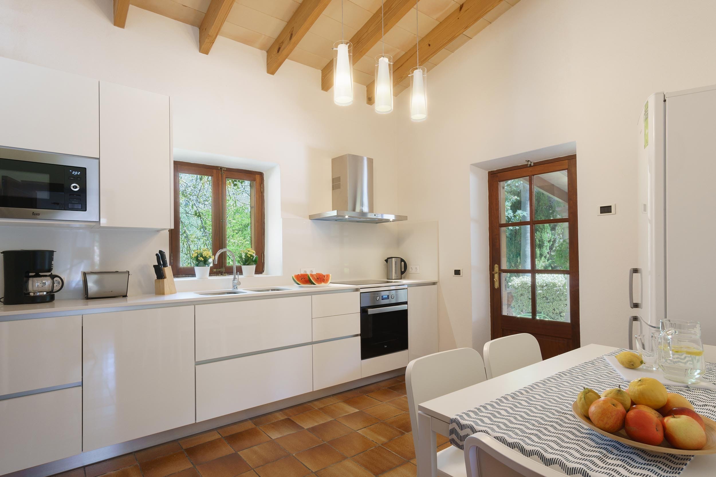 Desde la entrada principal se accede directamente al salón-comedor, una estancia amplia con techos altos de vigas vistas, muebles rústicos y una decoración sencilla en tonos naturales. El espacio resulta acogedor y muy luminoso gracias a los grandes ventanales que conectan con la terraza.