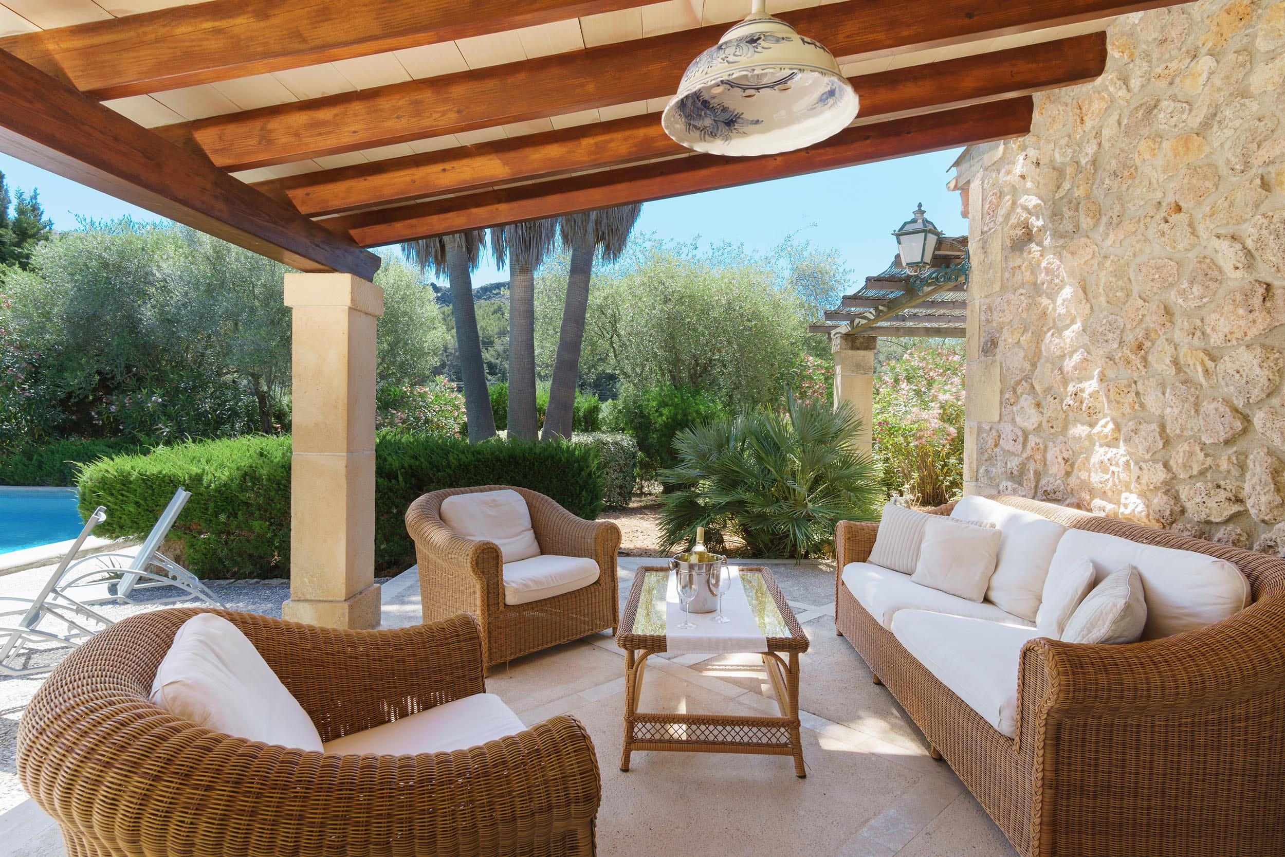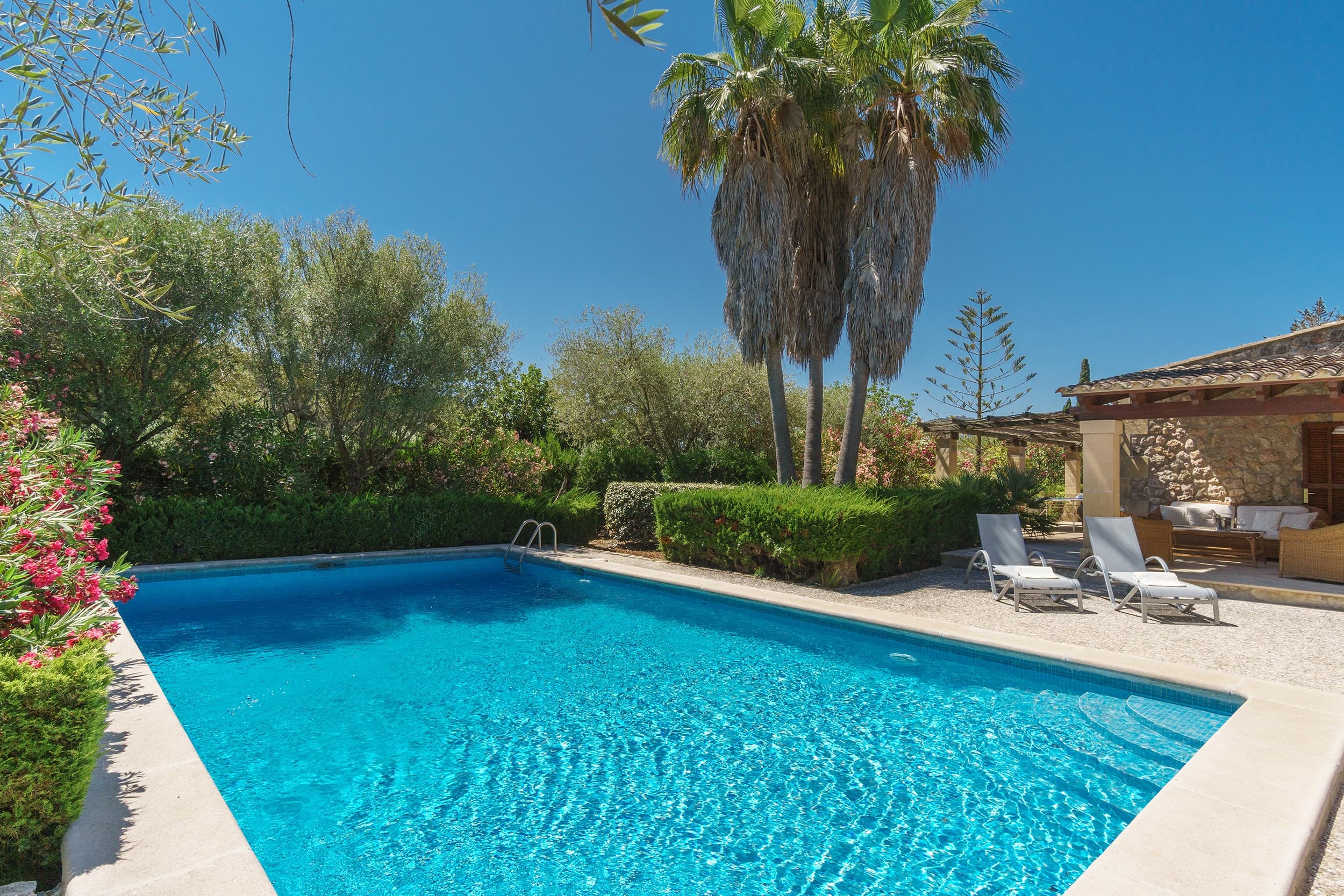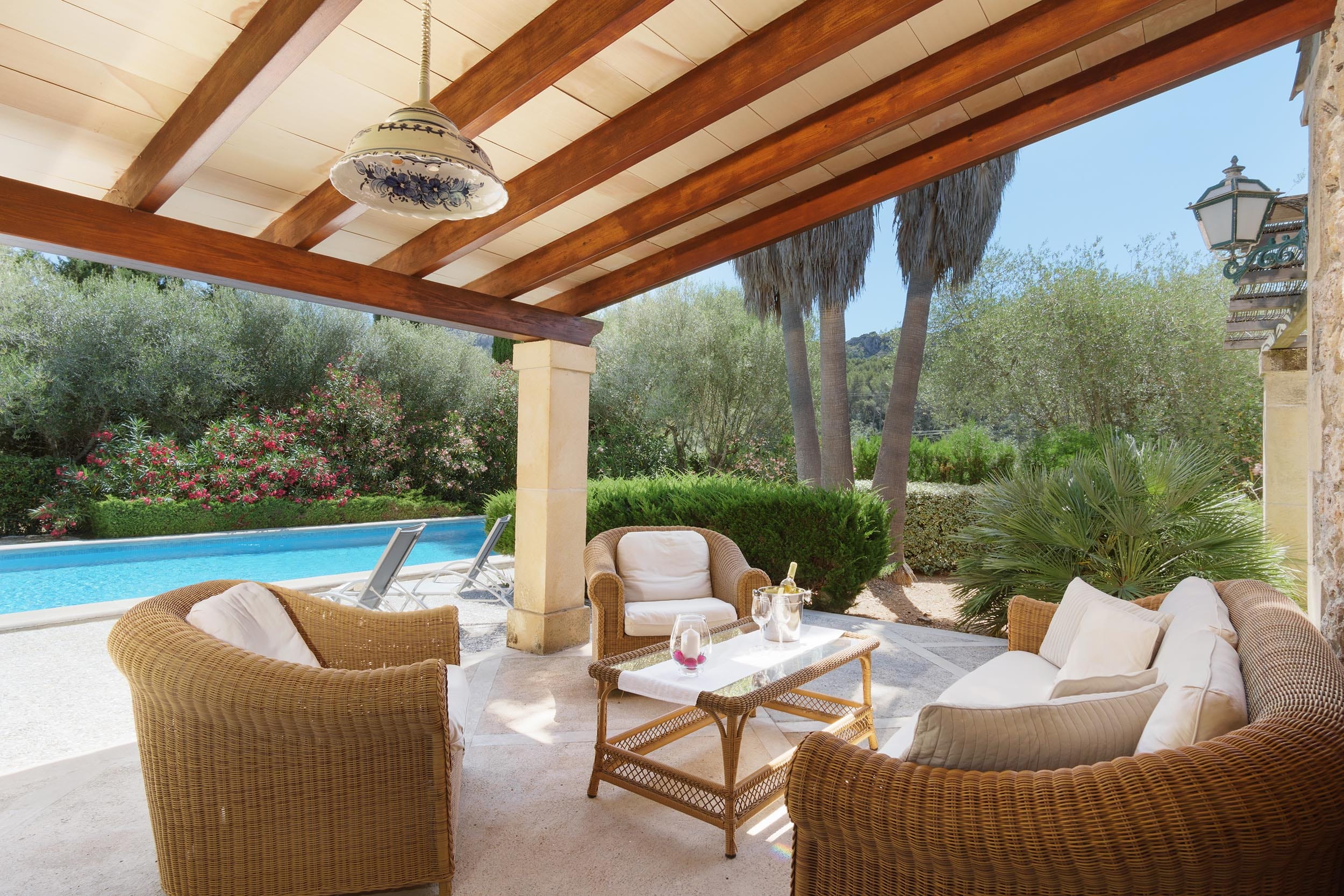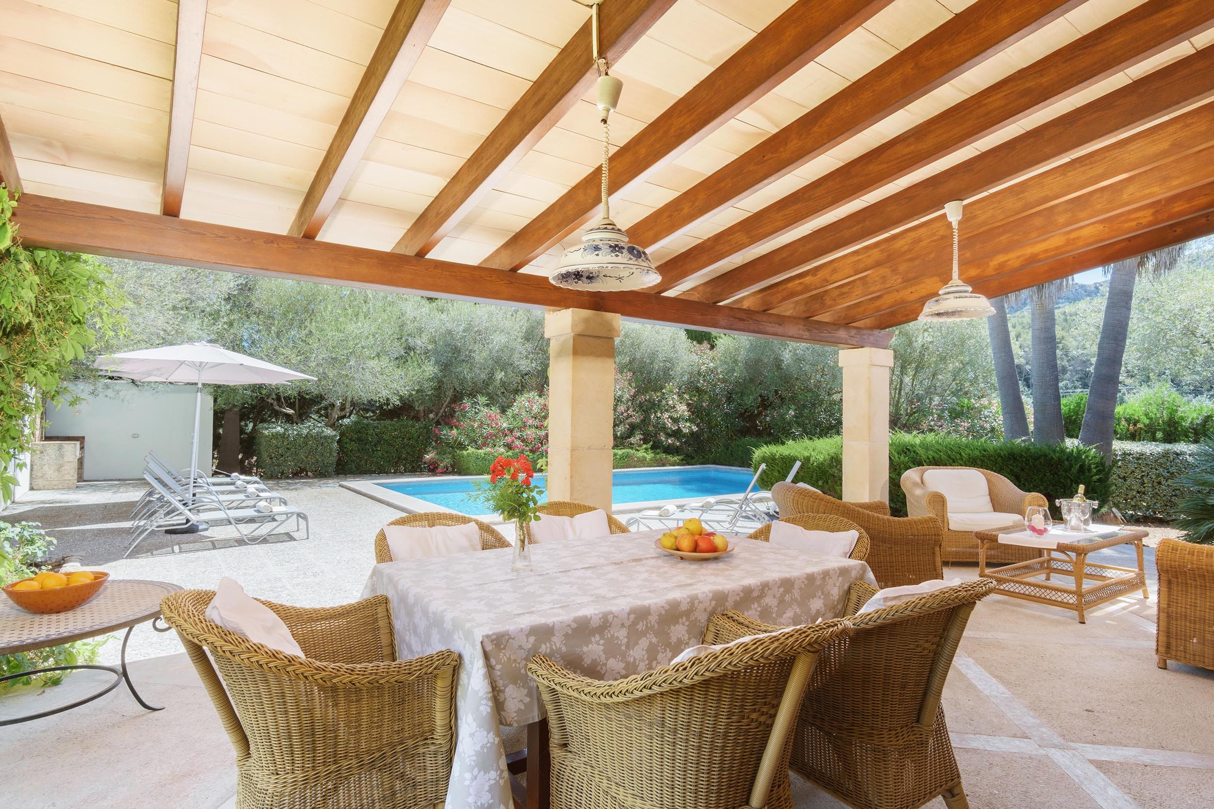 La terraza cubierta está equipada con una gran mesa y butacas, así como una zona de estar con mesita y balancines. Justo enfrente se encuentra la piscina (4 x 8 m), rodeada de una amplia zona de terraza con tumbonas y barbacoa.
