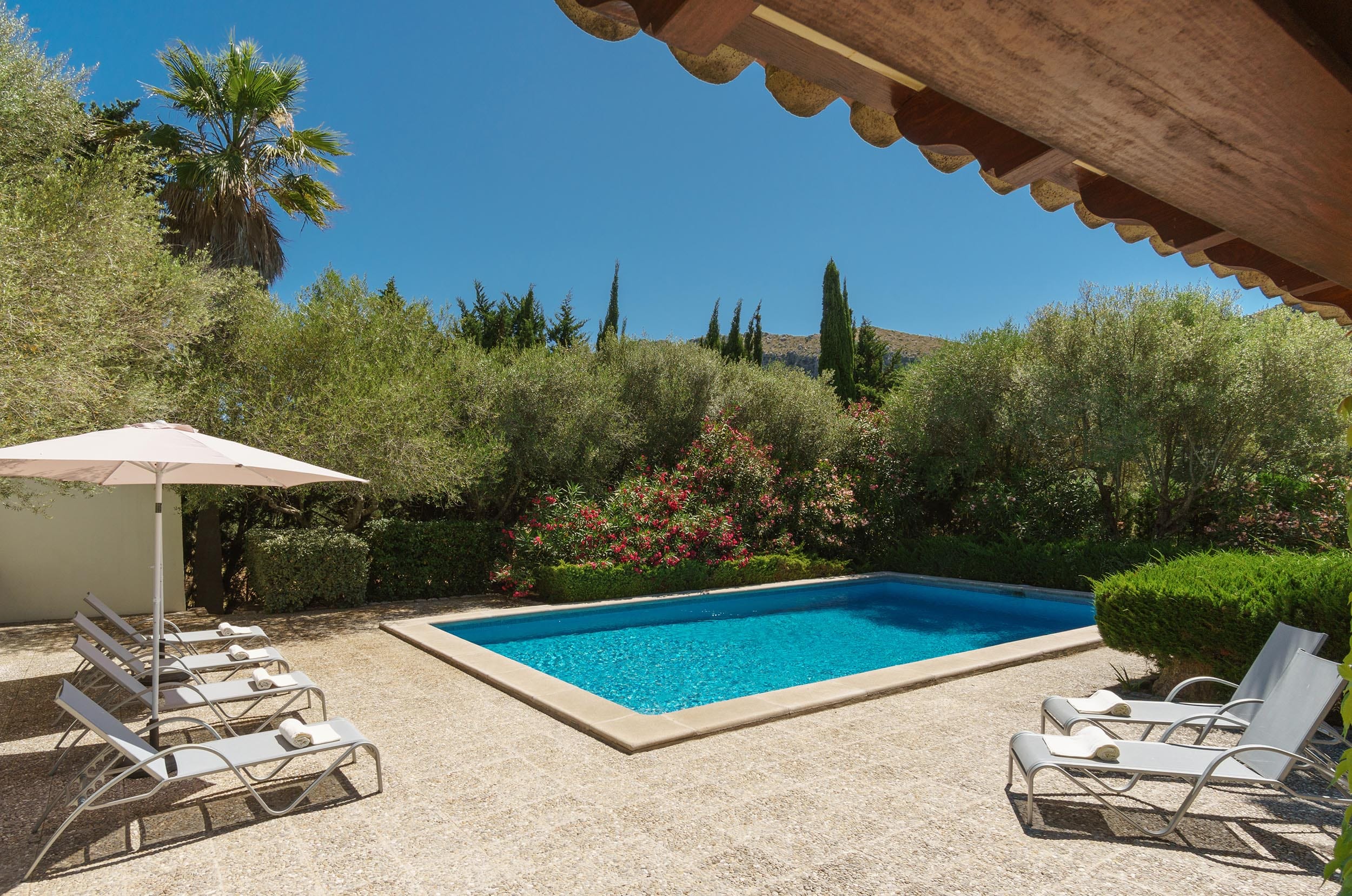 La playa más cercana se encuentra a 4 km, en Cala Sant Vicenç. El Puerto de Pollença está a solo 3 km y el centro histórico de Pollença a 5 km. En un radio de pocos minutos en coche hay supermercados, tiendas y una buena oferta de restaurantes.