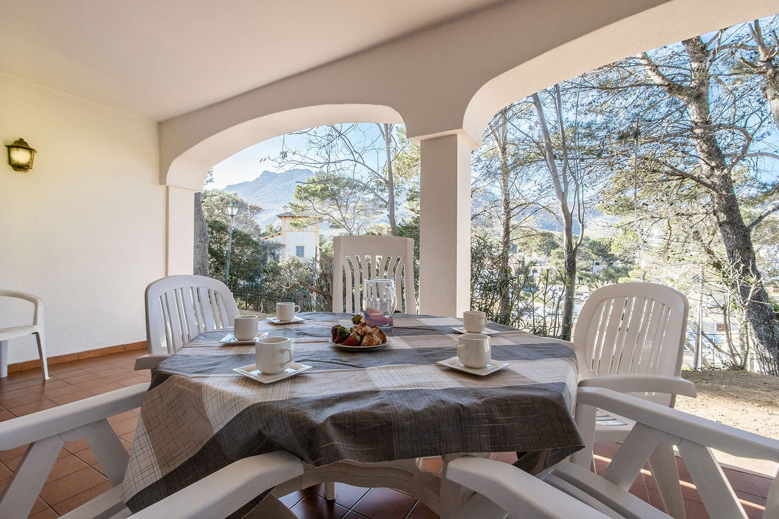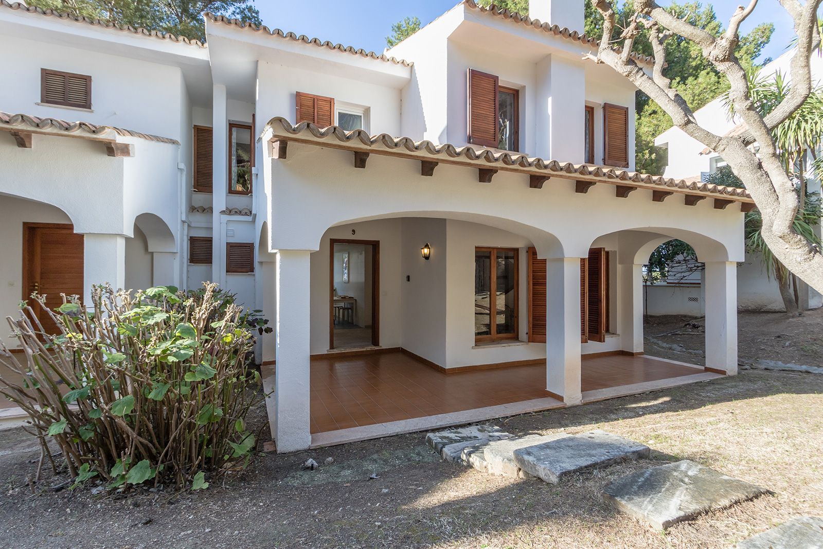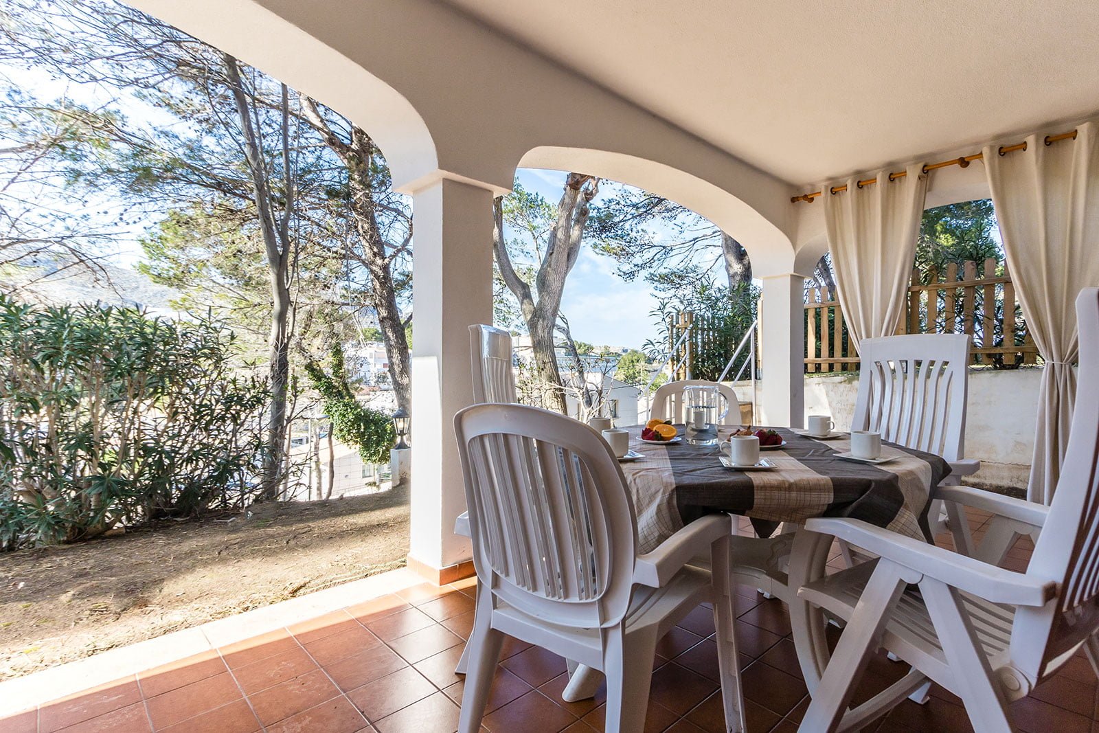 Can Botana 9 cuenta con una terraza privada delantera y otra trasera con acceso directo al jardín, lo que contribuye a la atmósfera general de la propiedad. Ofrece un refugio tranquilo con vegetación autóctona, ideal para disfrutar de comidas al aire libre en la mesa del porche trasero. El porche delantero conduce a la puerta de entrada a la casa, pero la mayoría de la vida se suele disfrutar desde la terraza trasera.