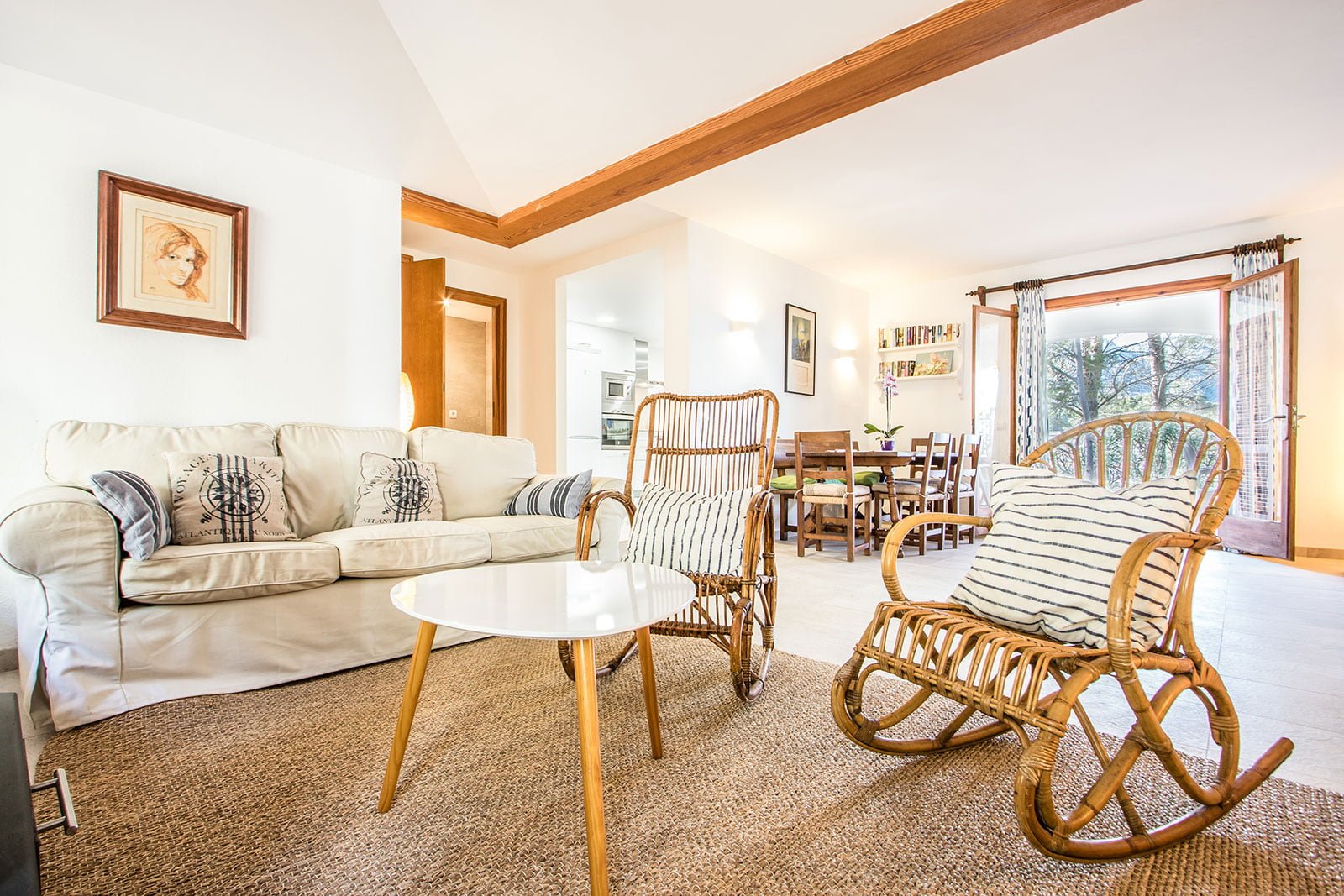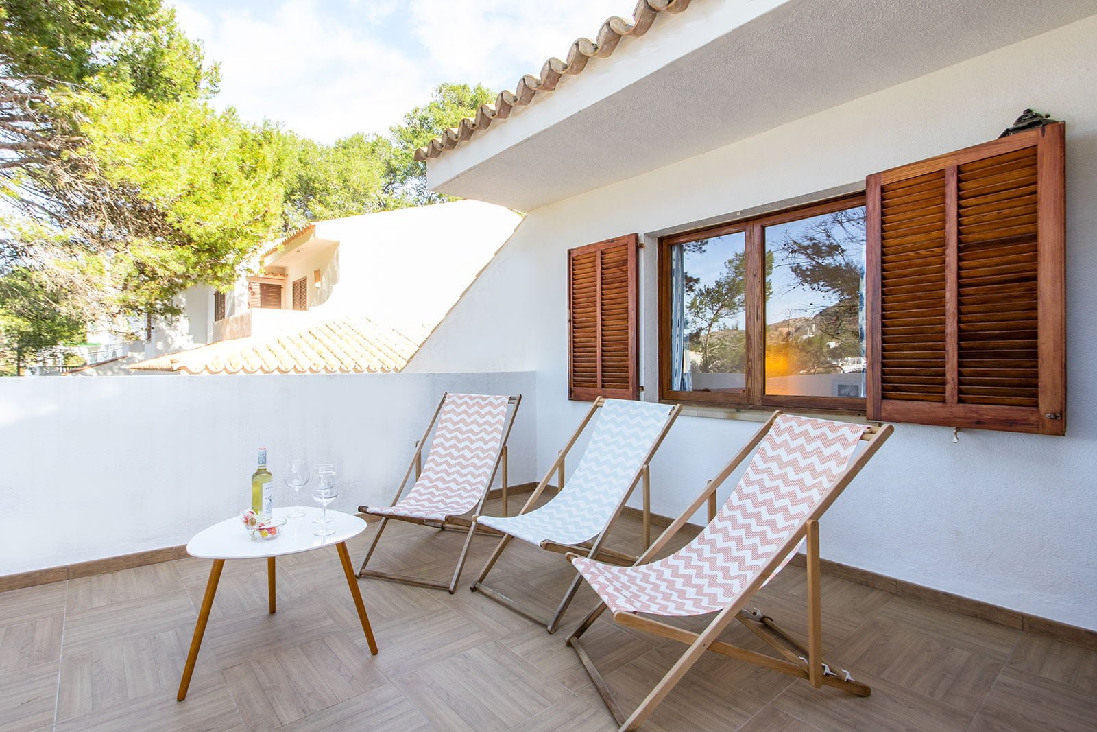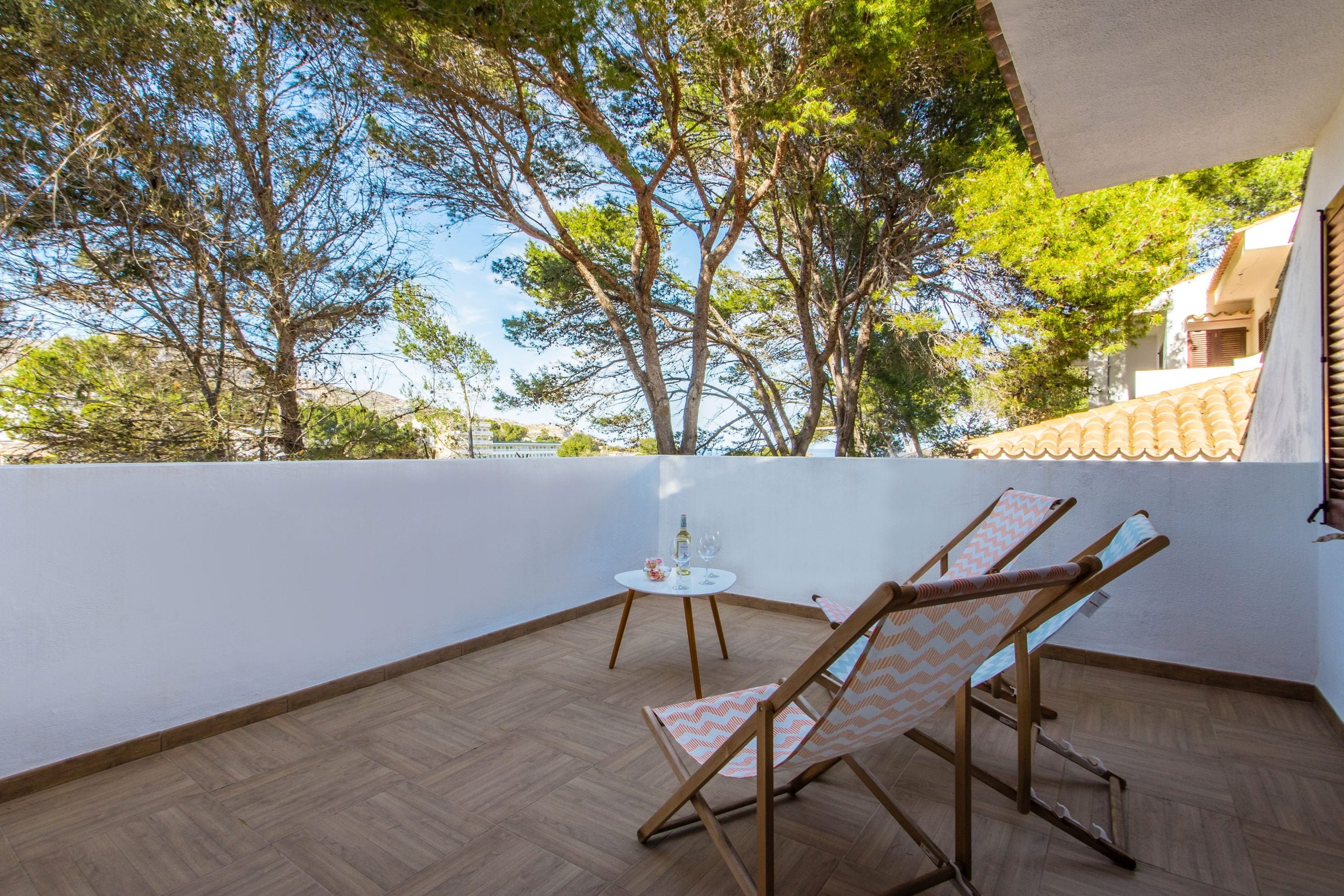 Can Botana 9 cuenta con una terraza privada delantera y otra trasera con acceso directo al jardín, lo que contribuye a la atmósfera general de la propiedad. Ofrece un refugio tranquilo con vegetación autóctona, ideal para disfrutar de comidas al aire libre en la mesa del porche trasero. El porche delantero conduce a la puerta de entrada a la casa, pero la mayoría de la vida se suele disfrutar desde la terraza trasera.