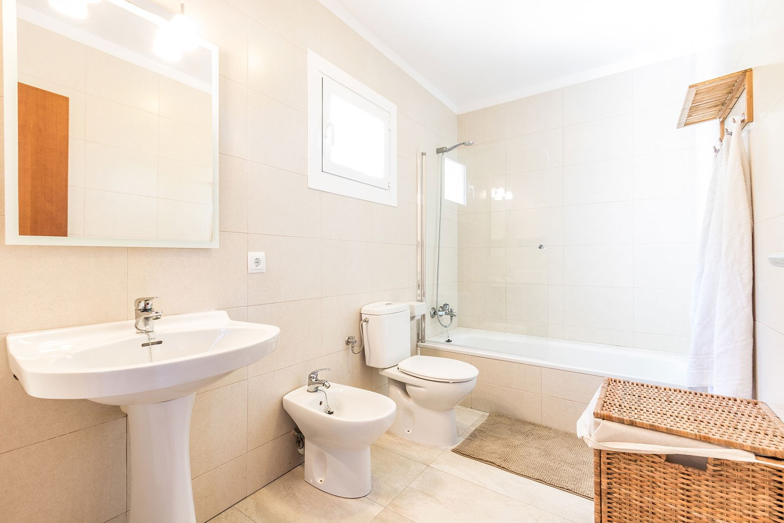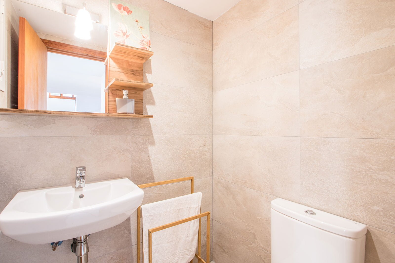 El baño principal, completo con bañera, es compartido por las dos habitaciones en la planta superior, mientras que la planta inferior se encuentra el aseo.